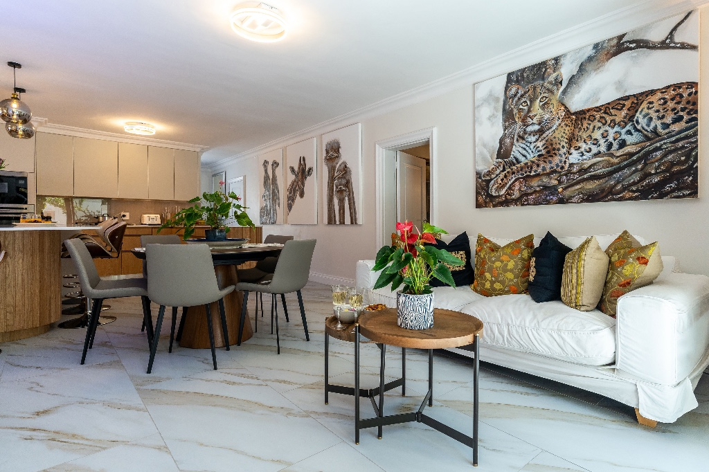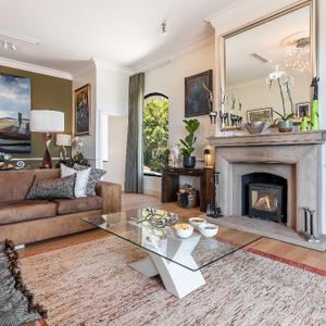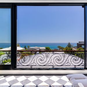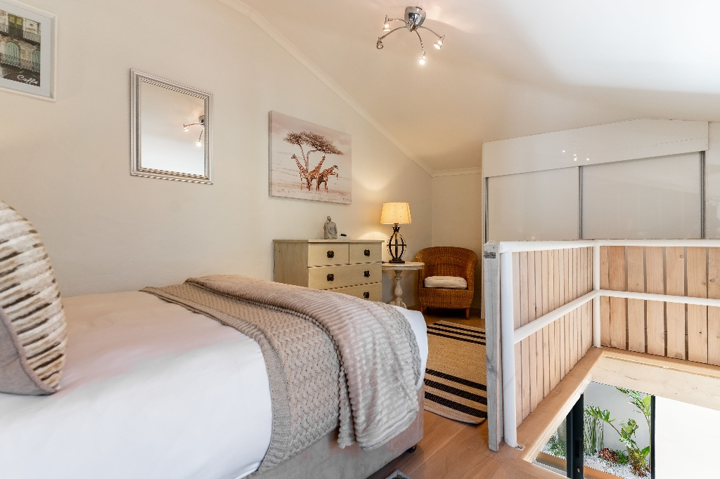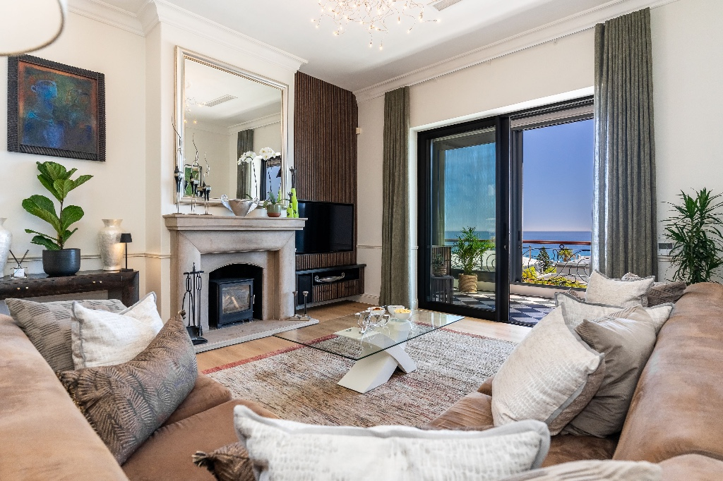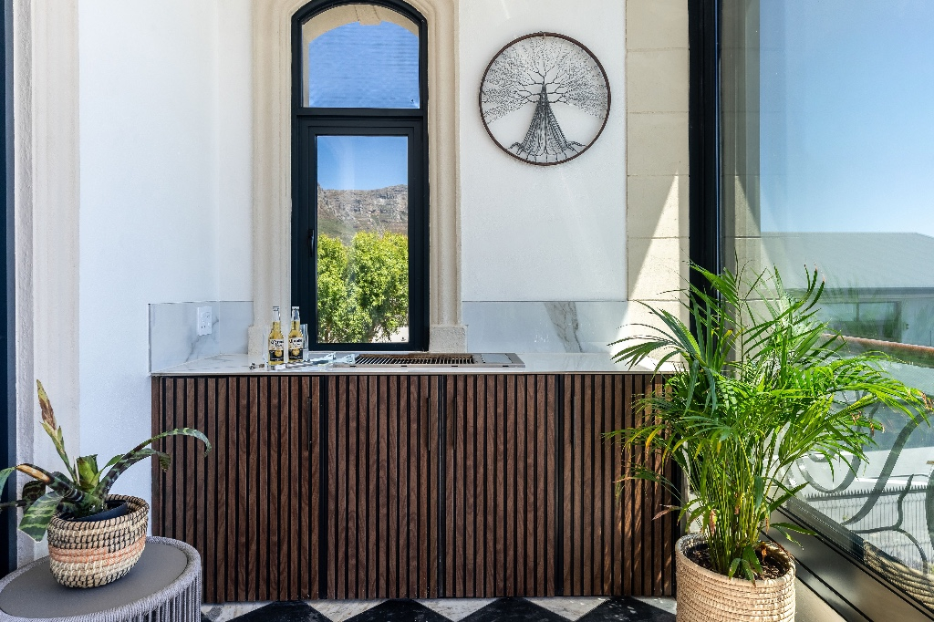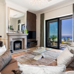Inside, the villa is designed for both relaxation and entertaining. The first level features a welcoming lounge area, a fully equipped kitchen with granite countertops and premium AEG appliances, and three beautifully appointed bedrooms - including a king-size bedroom with a walk-in closet. Upstairs, guests will find a second lounge with ultra-high ceilings, a fireplace, and access to a large balcony with outdoor furniture, a braai/BBQ, and breathtaking views of the Atlantic and Lion’s Head. Two additional bedrooms, including a second master bedroom with a luxurious en-suite bathroom, complete the upper level.