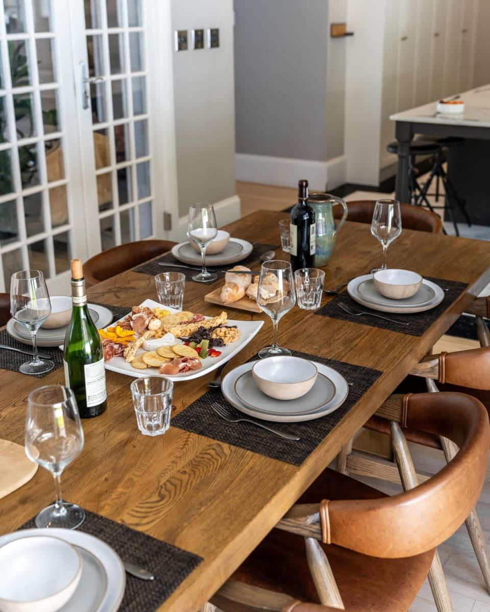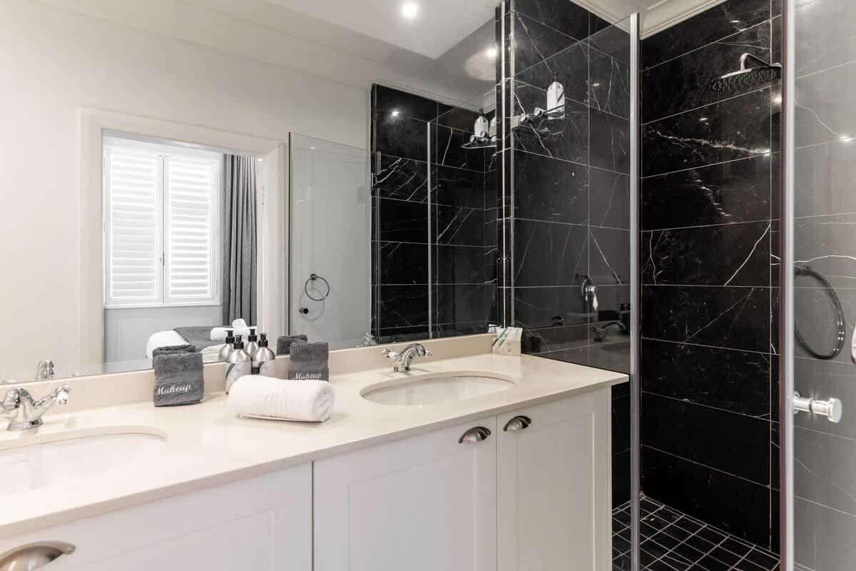 The interior showcases a blend of timeless design and contemporary flair, with strategic mirrors amplifying openness and a calming neutral palette. Notable features include a custom-designed French oak dining table and a guest bathroom adorned with elegant fixtures, creating an atmosphere of refined sophistication throughout.