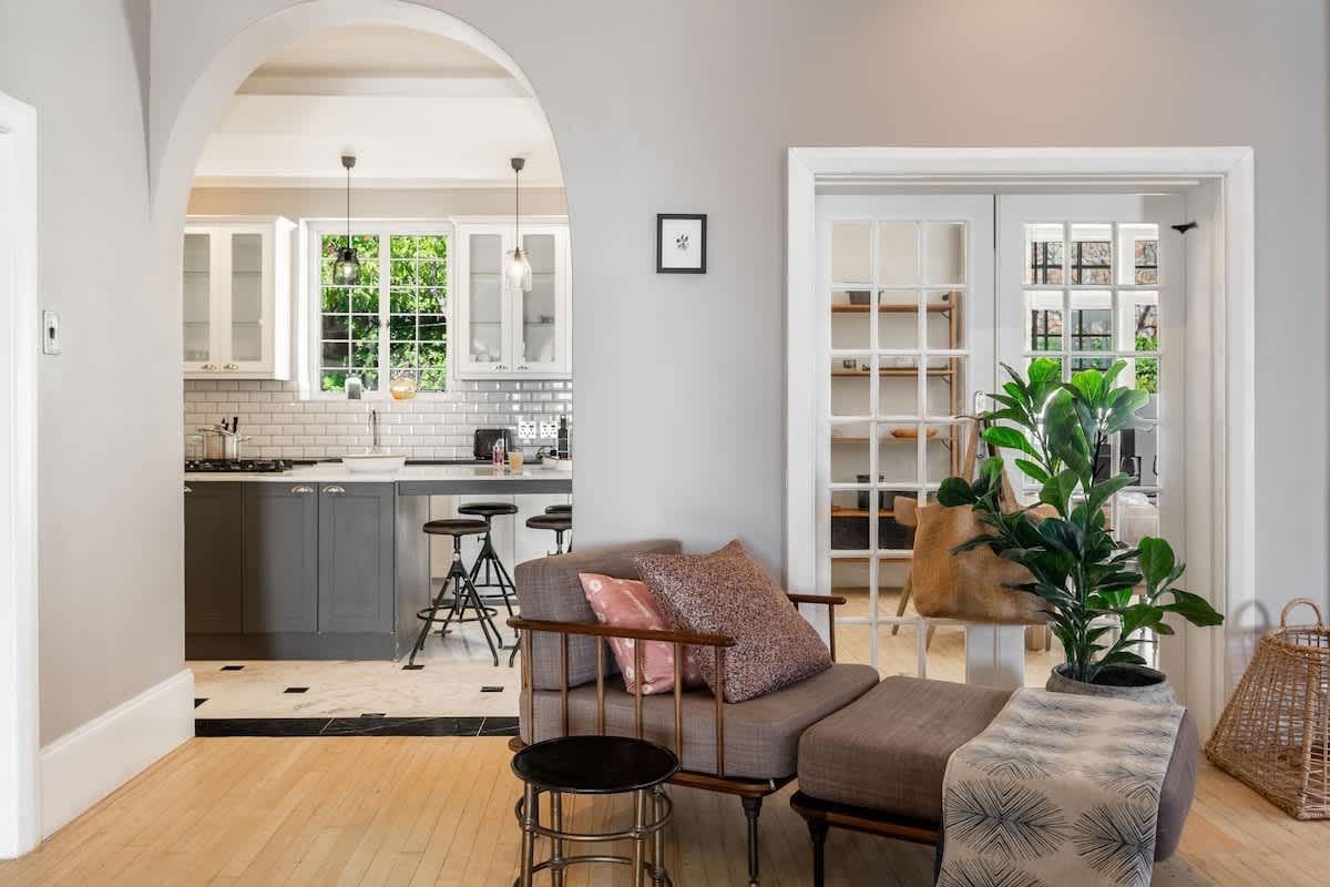 The fully equipped modern kitchen, featuring premium appliances and granite countertops, is ideal for culinary enthusiasts and hosting gatherings. An elegant dining room comfortably seats eight and opens to a charming courtyard for seamless indoor-outdoor dining.