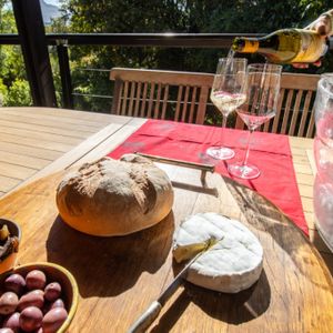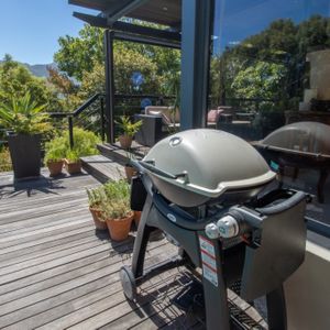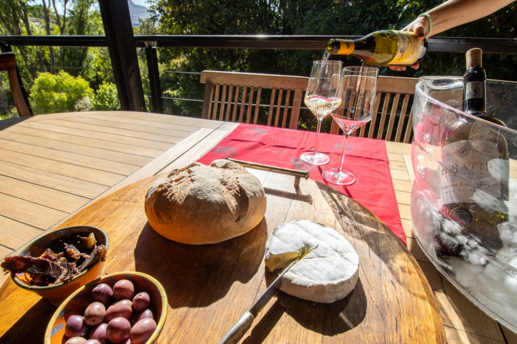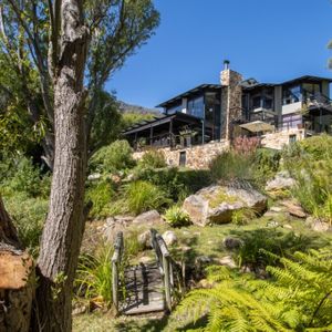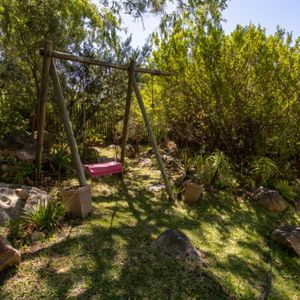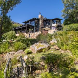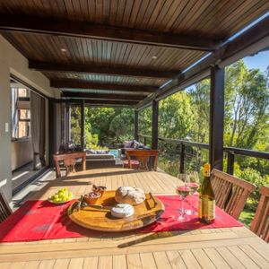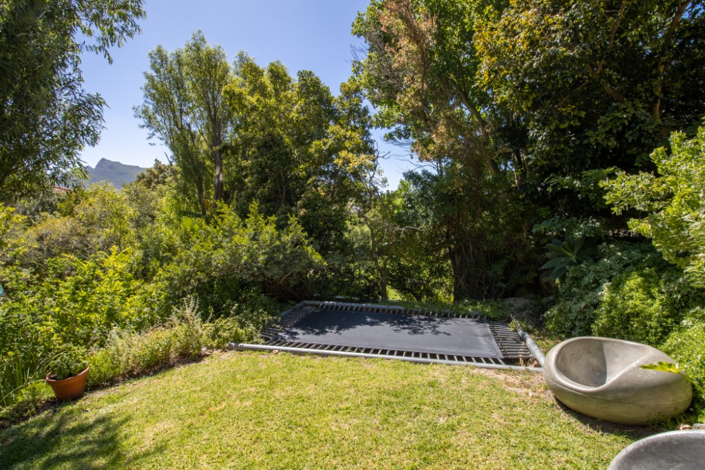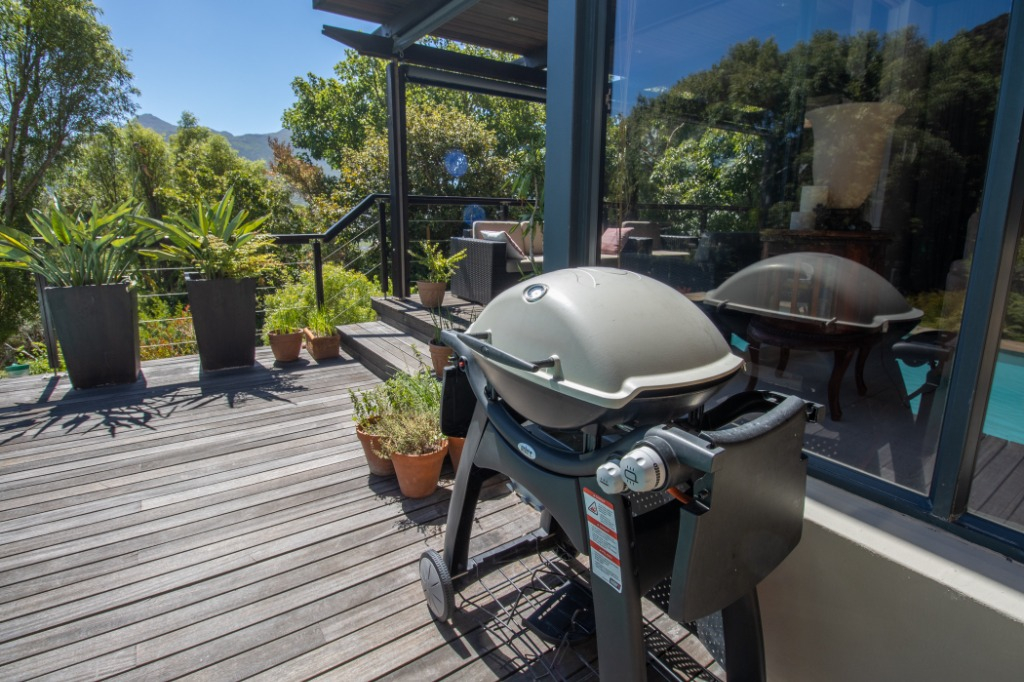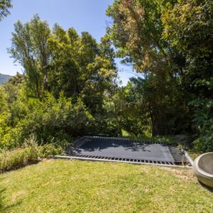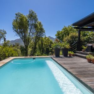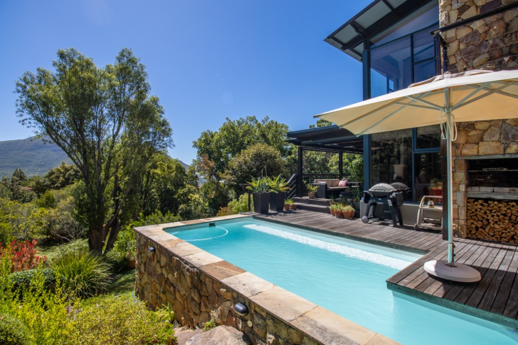 The outdoor living spaces are designed for relaxation and entertaining, with a large covered deck adorned with soft furnishings, a sparkling pool, a gas braai, and a generous ten-seater dining table. Guests can unwind beneath a sun umbrella or on one of six loungers, while children enjoy the garden’s trampoline and swing. Ornate bridges cross the mountain stream, leading to the villa’s natural beauty.