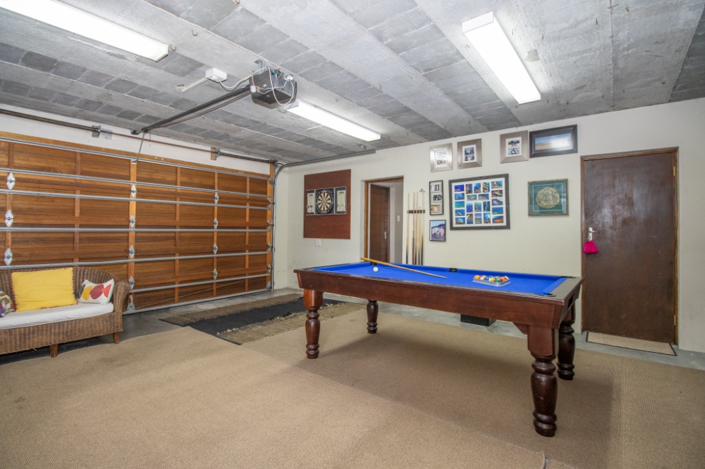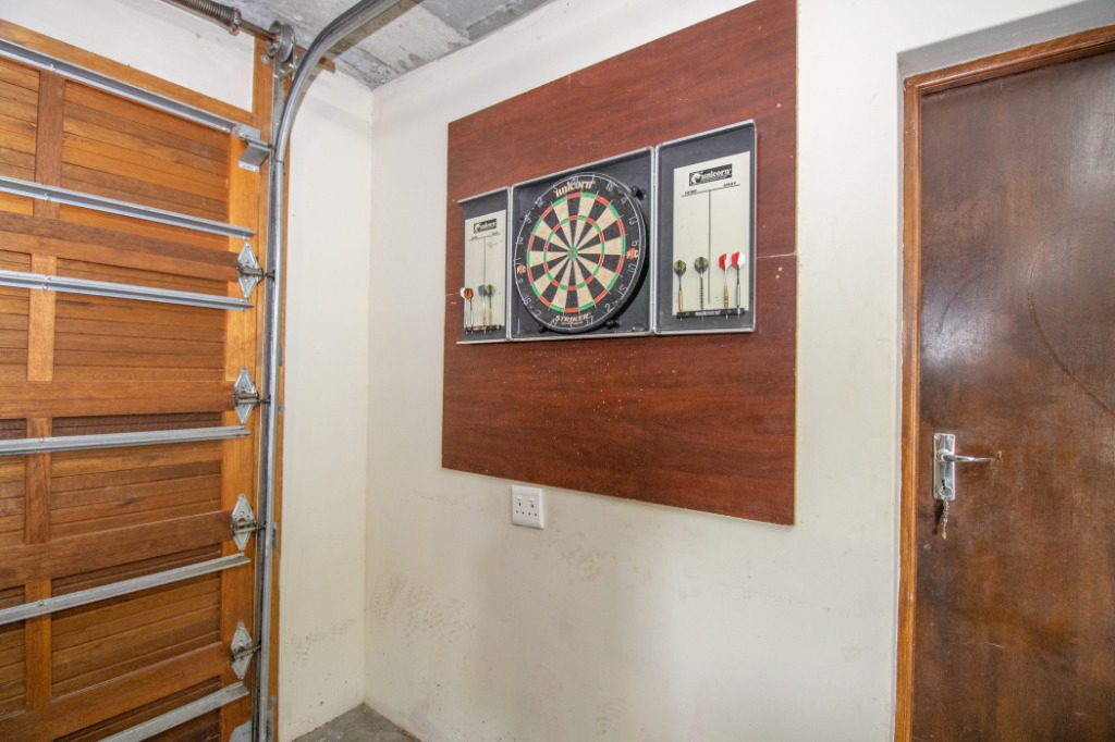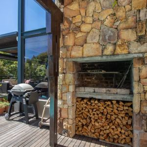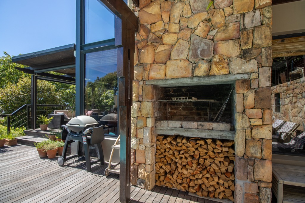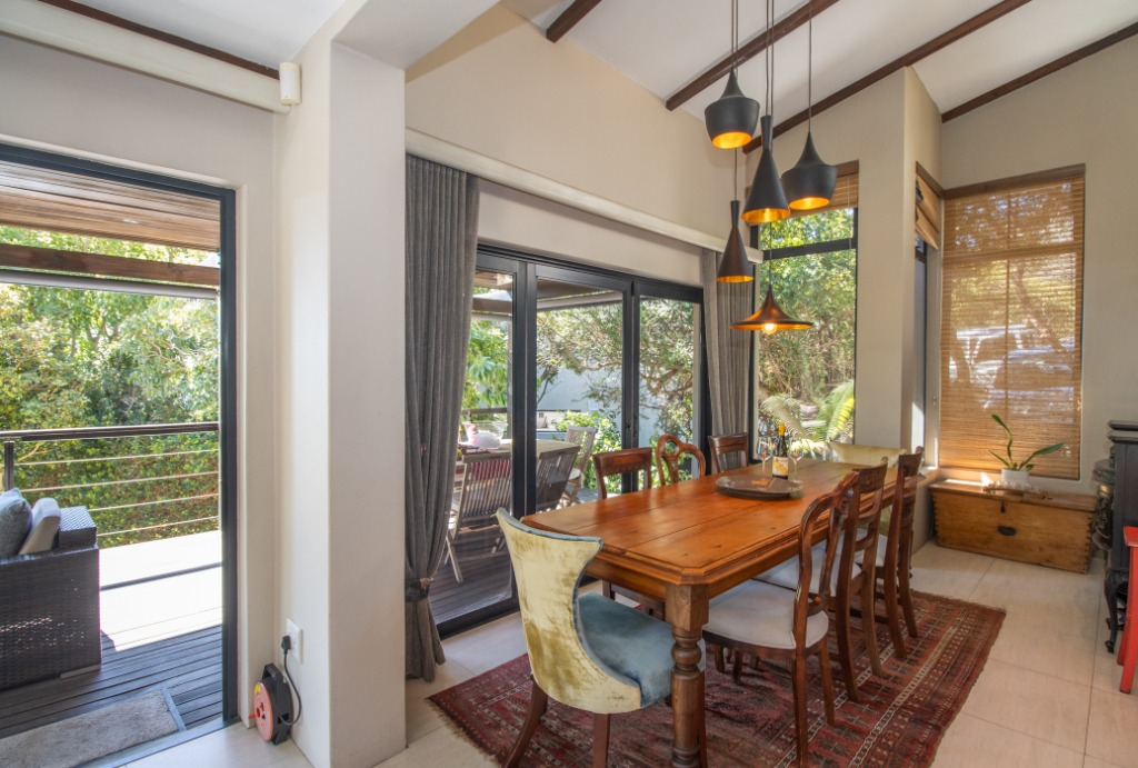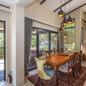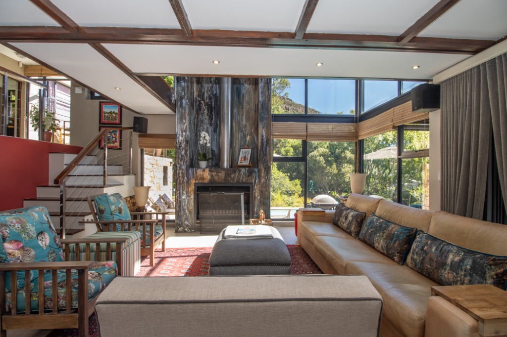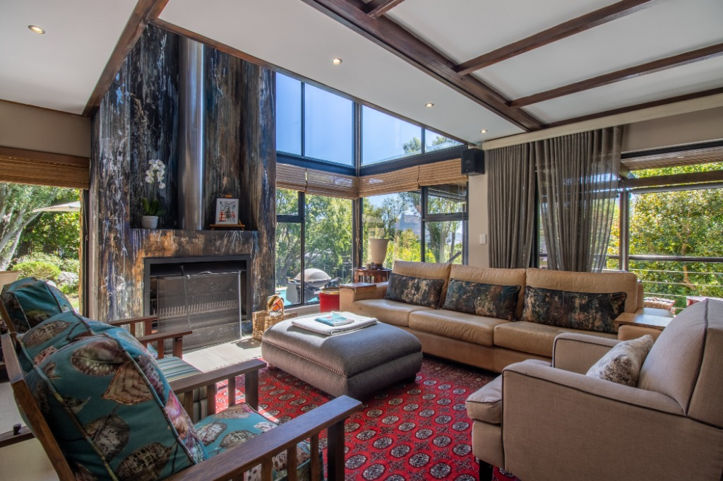 Inside, the home offers a sunken lounge with a large indoor fireplace, a surround sound music system, and a spacious TV with DSTV. A study area provides a quiet retreat, while the elegant dining space seats eight and opens onto panoramic valley views.