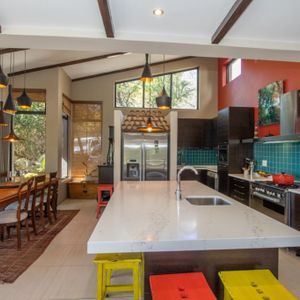 Villa Vida is a modern, eclectic and spacious home, nestled within a park-like garden on the slopes of the Baviaanskloof. Surrounded by sweeping mountain vistas and offering a glimpse of the bay below, this four-bedroom villa blends contemporary design with the serenity of nature.