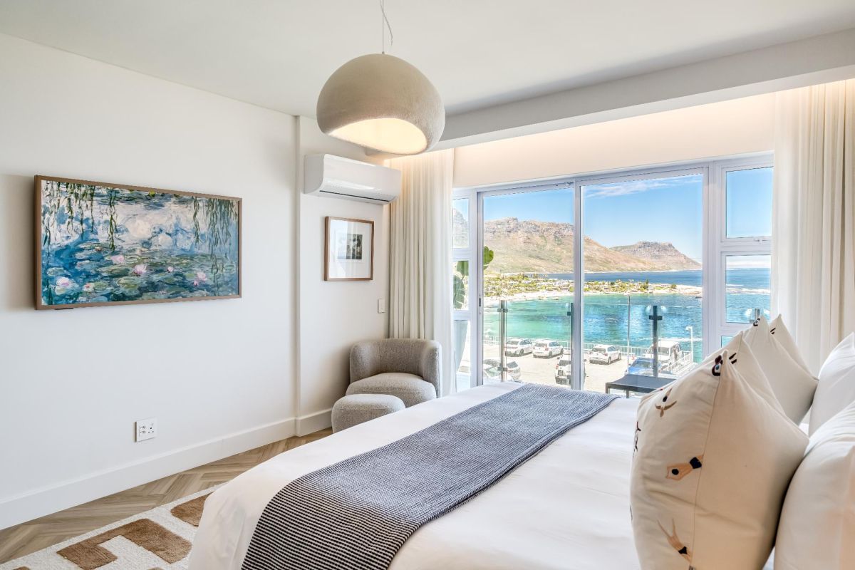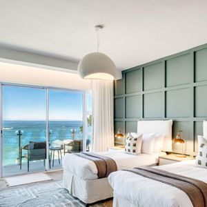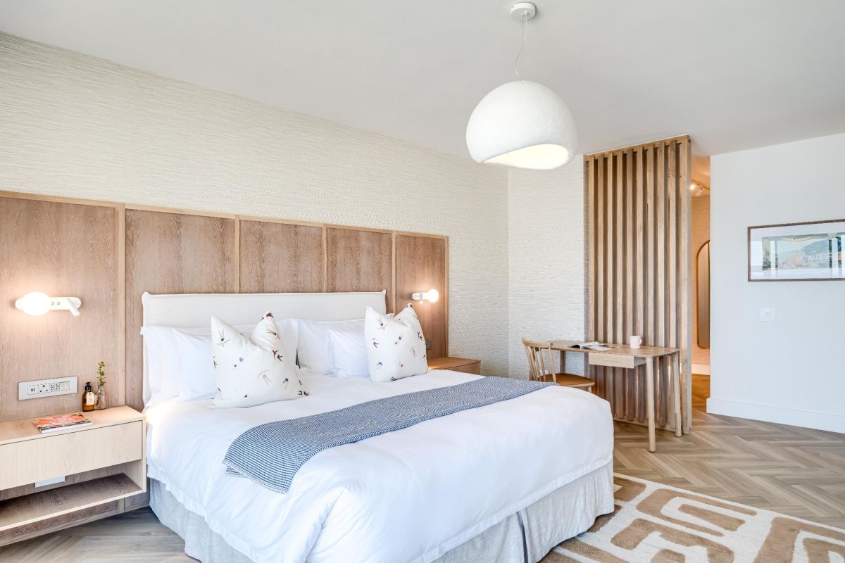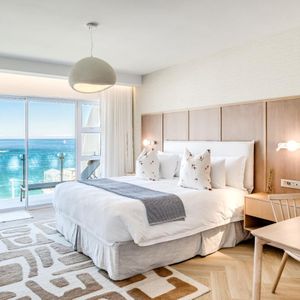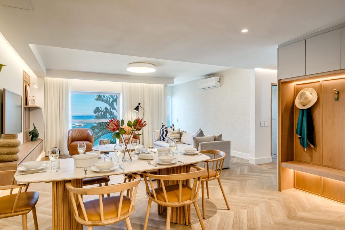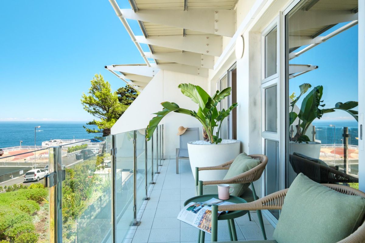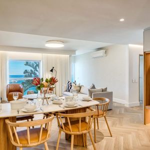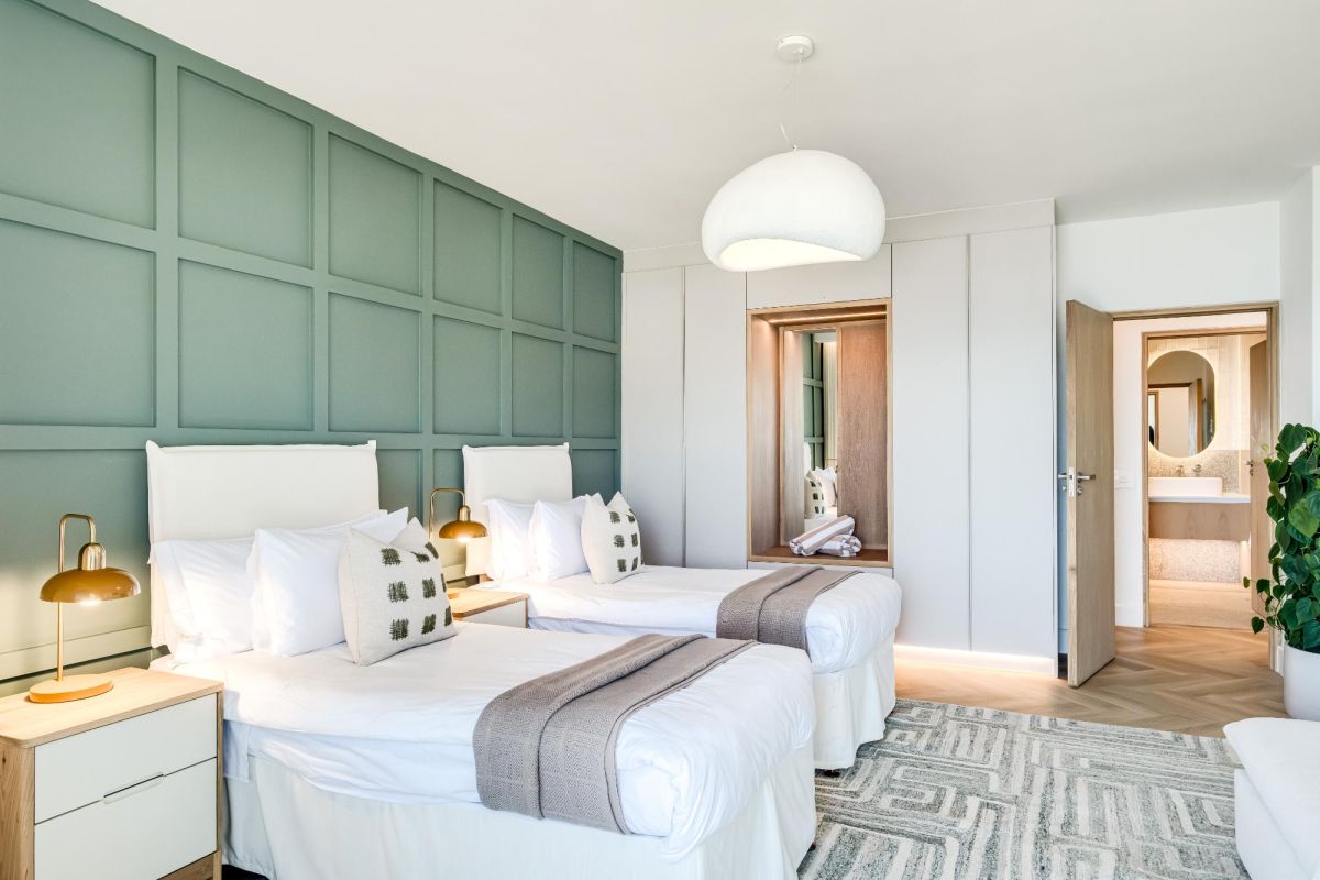 The apartment features two sea-facing bedrooms, both opening onto a shared balcony with sweeping Atlantic views. The master suite is appointed with a king-size bed, dressing area, dedicated workspace, and a luxurious en-suite bathroom with both bath and shower. The second bedroom offers a flexible twin-to-king configuration and is served by a separate bathroom with a walk-in shower.