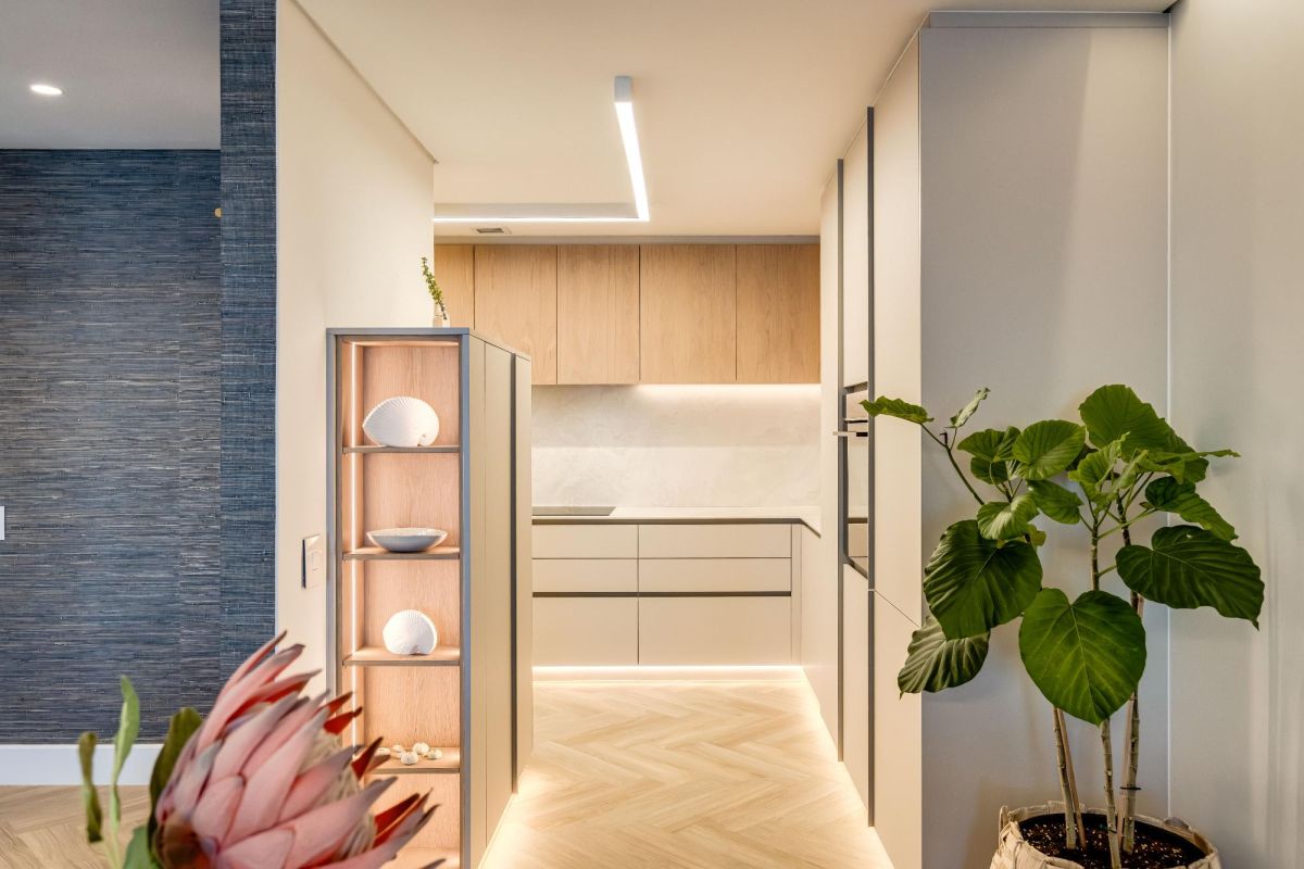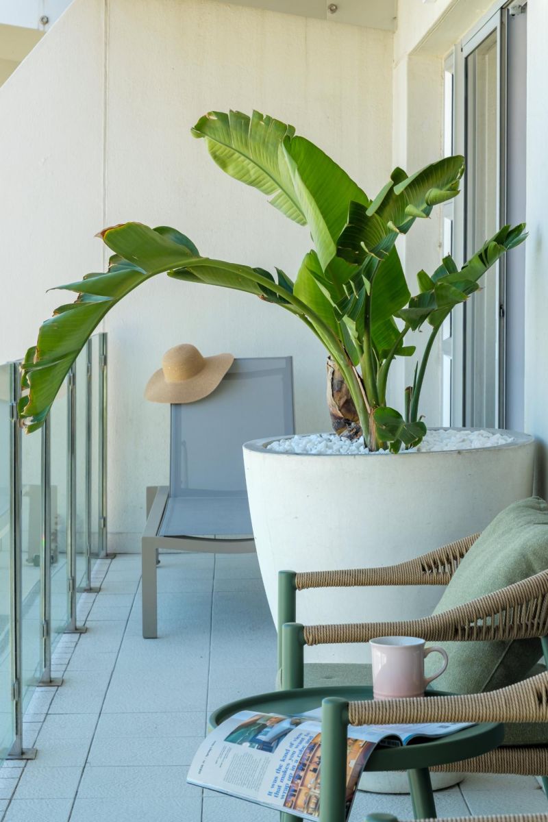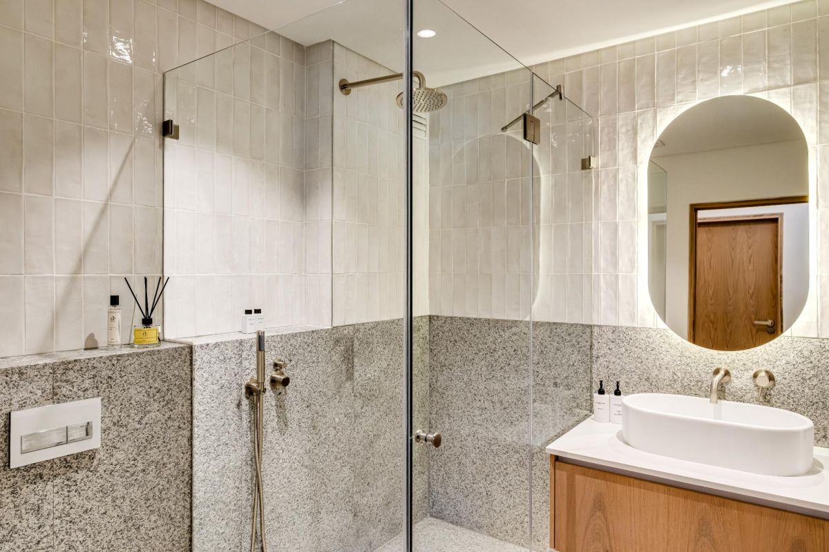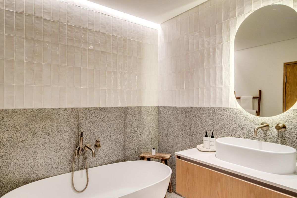 The apartment features two sea-facing bedrooms, both opening onto a shared balcony with sweeping Atlantic views. The master suite is appointed with a king-size bed, dressing area, dedicated workspace, and a luxurious en-suite bathroom with both bath and shower. The second bedroom offers a flexible twin-to-king configuration and is served by a separate bathroom with a walk-in shower.