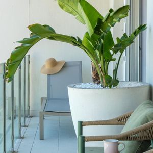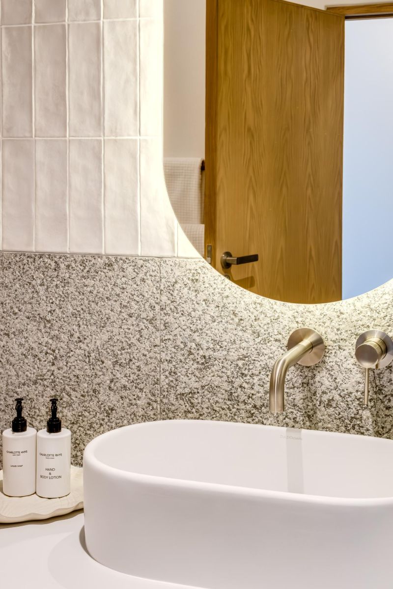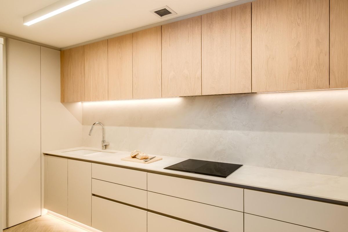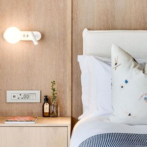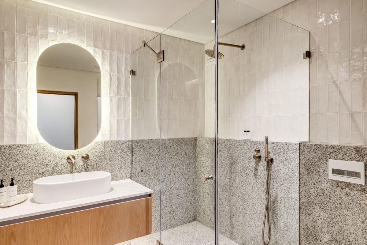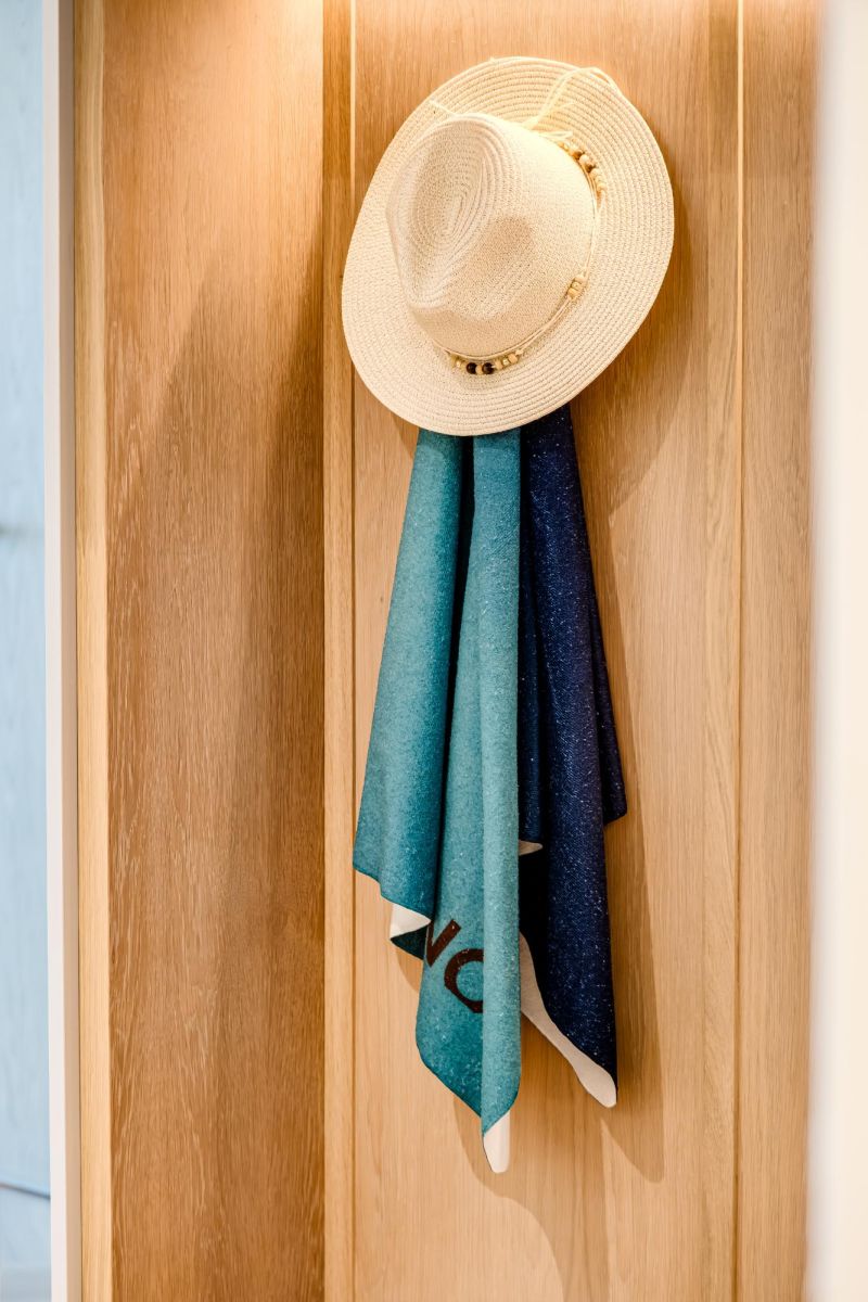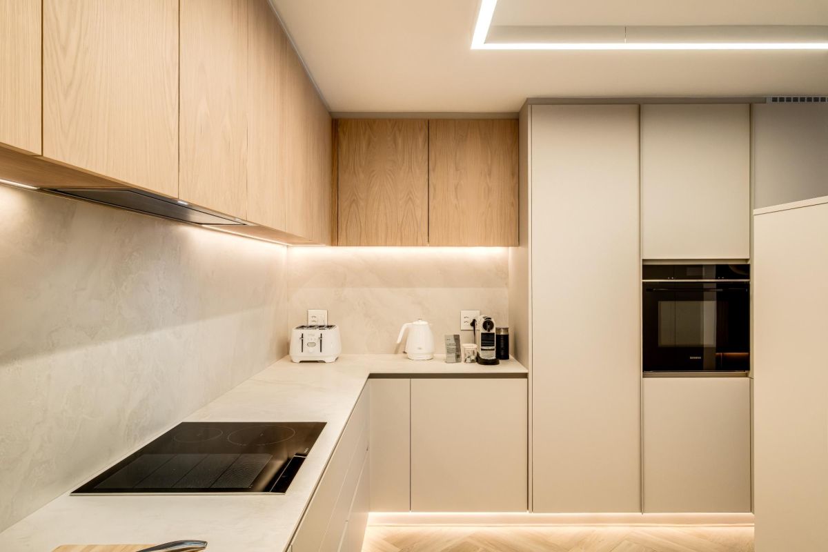 The apartment features two sea-facing bedrooms, both opening onto a shared balcony with sweeping Atlantic views. The master suite is appointed with a king-size bed, dressing area, dedicated workspace, and a luxurious en-suite bathroom with both bath and shower. The second bedroom offers a flexible twin-to-king configuration and is served by a separate bathroom with a walk-in shower.